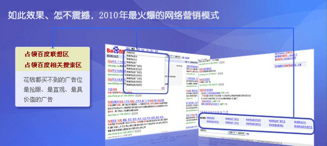 1.百度相關(guān)搜索相對與百度競價排名具有明顯價格優(yōu)勢。競價排名按點擊率收費,而百度相關(guān)搜索采用包月方式,不管點擊量多大,費用不變。