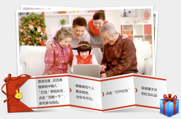 寓意平安送福的紅包,是中國年里最溫情的親朋紐帶。而2011兔年春節(jié)的紅包尤其特別。據(jù)悉,從2月2日到2月17日(大年三十到正月十五),只要登錄百度首頁,在搜索框中輸入“紅包”及包含紅包的關(guān)鍵字,搜索與紅包相關(guān)的信息,即可得到紅包大禮。全民可參與,操作極簡單,用紅包回饋新老網(wǎng)民……對于這近乎“瘋狂”的舉動,業(yè)內(nèi)人士認(rèn)為,百度此次借春節(jié)全民“大遷徙”的時機(jī)組織的搶紅包活動,一二線城市深度網(wǎng)絡(luò)用戶將極大帶動地縣級城市的新網(wǎng)民參與,讓我國偏遠(yuǎn)地區(qū)和互聯(lián)網(wǎng)不發(fā)達(dá)的地縣級城市百姓能夠接觸互聯(lián)網(wǎng),該活動的公益價值將給中國互聯(lián)網(wǎng)帶來深遠(yuǎn)的影響。