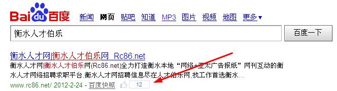 近日,百度進(jìn)行了大更新,此次更新后,很多細(xì)心的站長(zhǎng)都發(fā)現(xiàn)了,在搜索結(jié)果中耗子發(fā)現(xiàn)有些網(wǎng)站快照后面出現(xiàn)了一個(gè)“多少人喜歡”的大拇指。相信現(xiàn)在有很多站長(zhǎng)都在研究這個(gè)“多少人喜歡”的大拇指是怎么添加上去的,下面就由我和大家細(xì)細(xì)說(shuō)來(lái),先拿大成未來(lái)的網(wǎng)站,在百度中搜索“衡水人才伯樂網(wǎng)”為例看下圖: